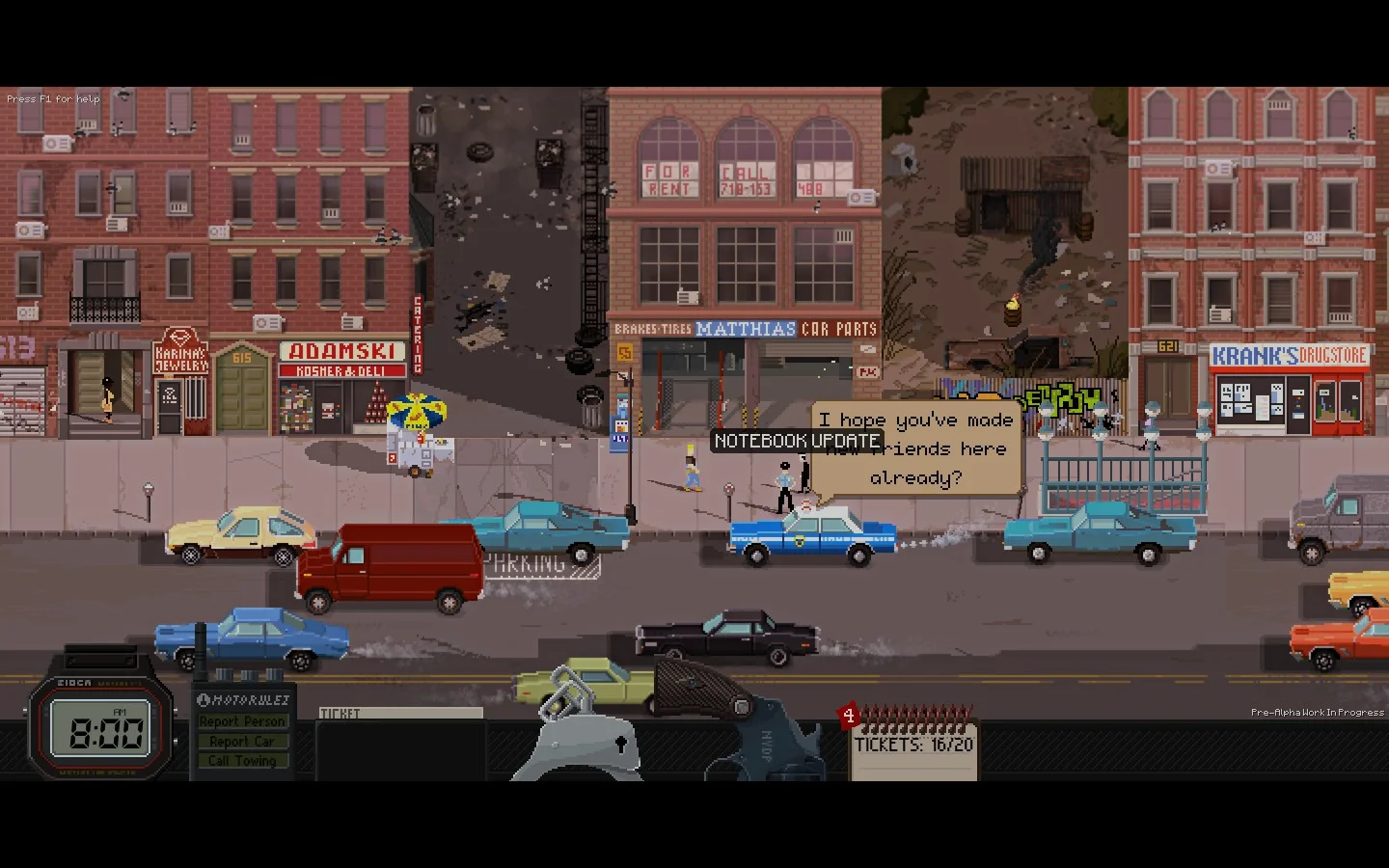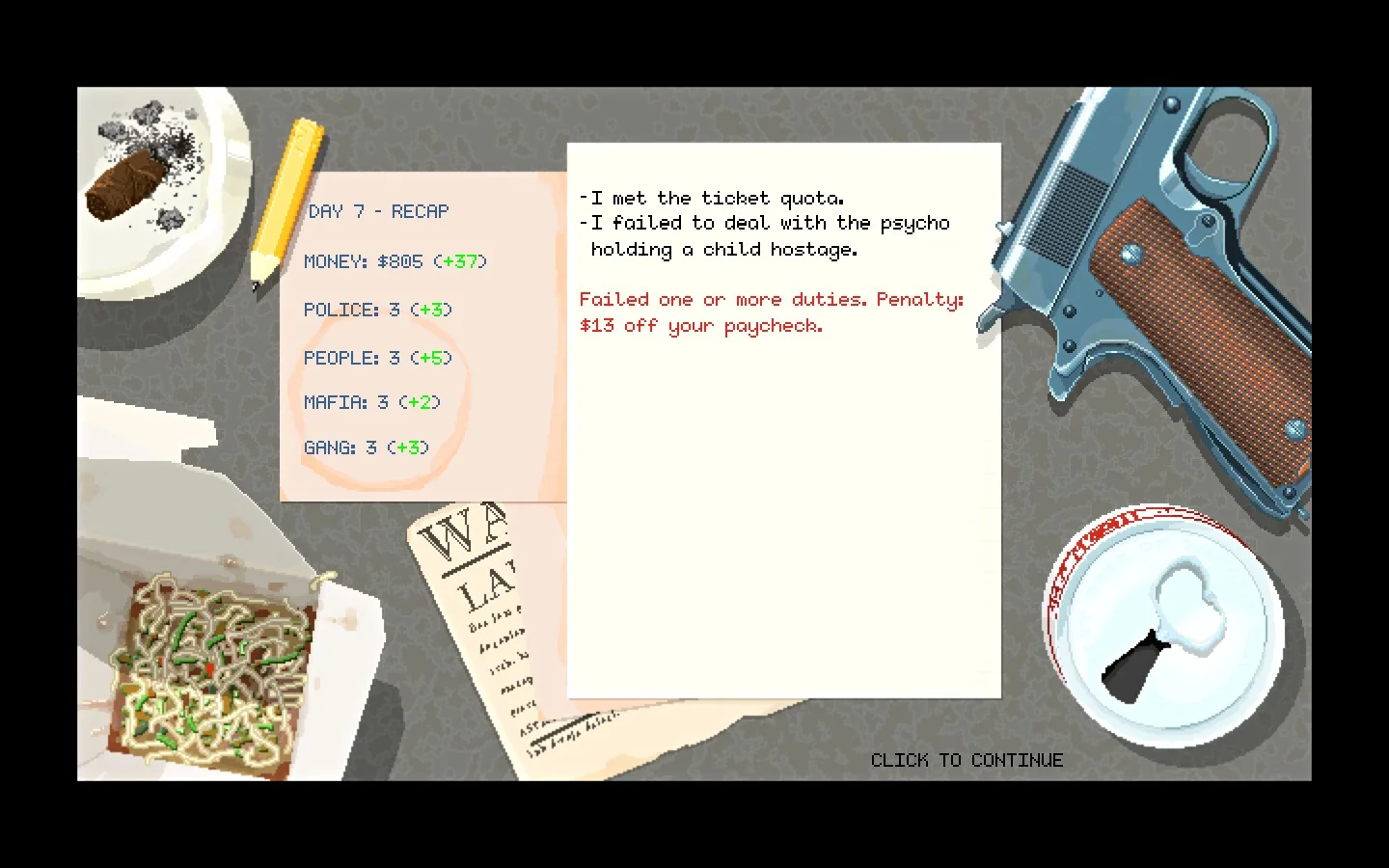 Il gioco si complica rapidamente, gettando sul giocatore incarichi molteplici con finestre temporali semplicemente insufficienti per essere affrontati tutti. La cosa diventa evidente quando nell’arco di dieci minuti si devono fare venti multe, assicurare che davanti al ristorante della mafia non ci siano auto parcheggiate, salvare il gattino di una bambina ed evitare che un’altra ragazzina finisca col cranio esploso da un pazzoide che la tiene in ostaggio. A questo aggiungiamoci che le multe abbassano la reputazione di cui si gode presso la cittadinanza (che inizia a non voler più aiutare e segnalare crimini) e che servono soldi per pagare alimenti alla propria moglie, cosa che spinge a prendere mazzette, peggiorando ancora di più la propria situazione legale e… insomma, un macello.