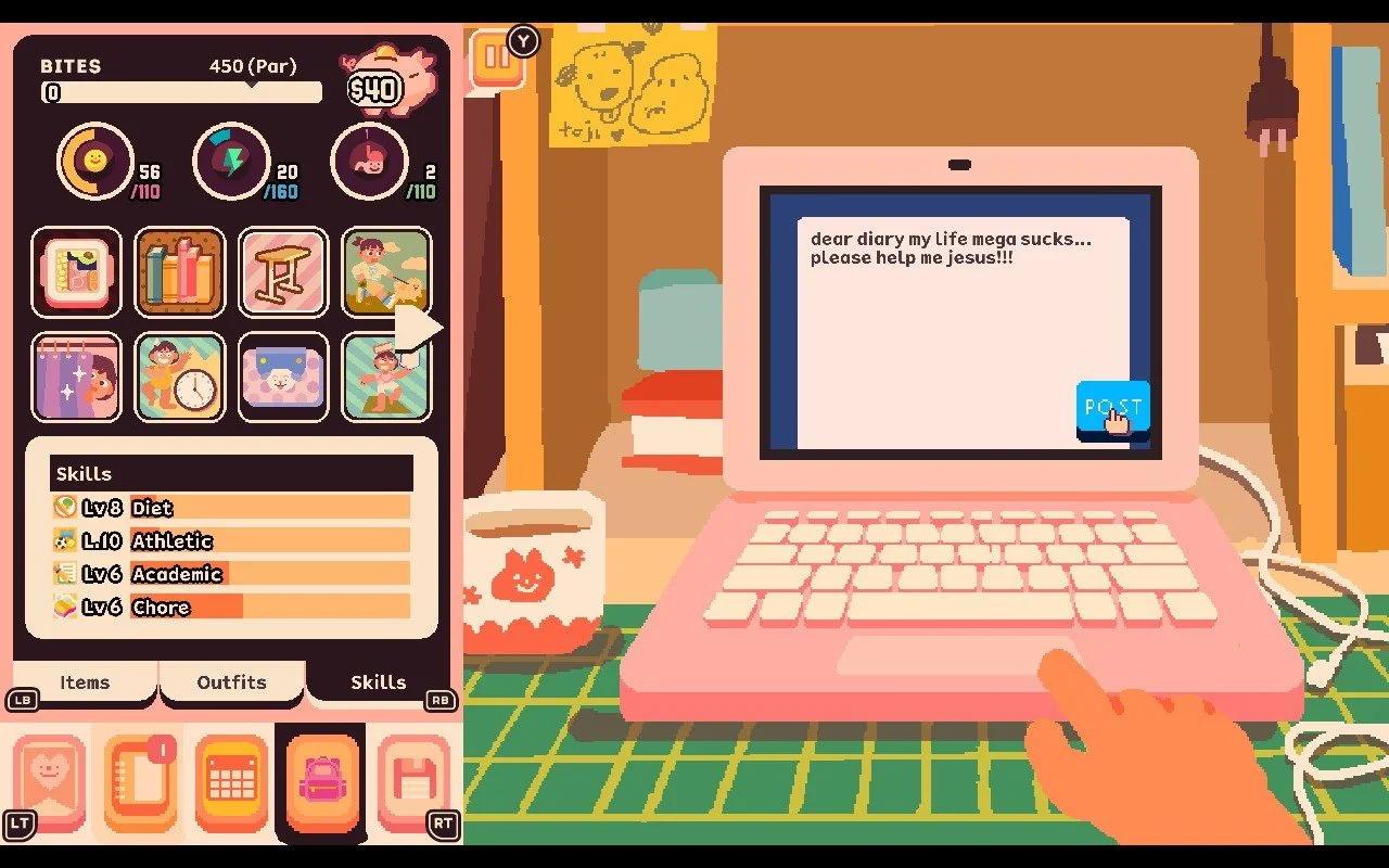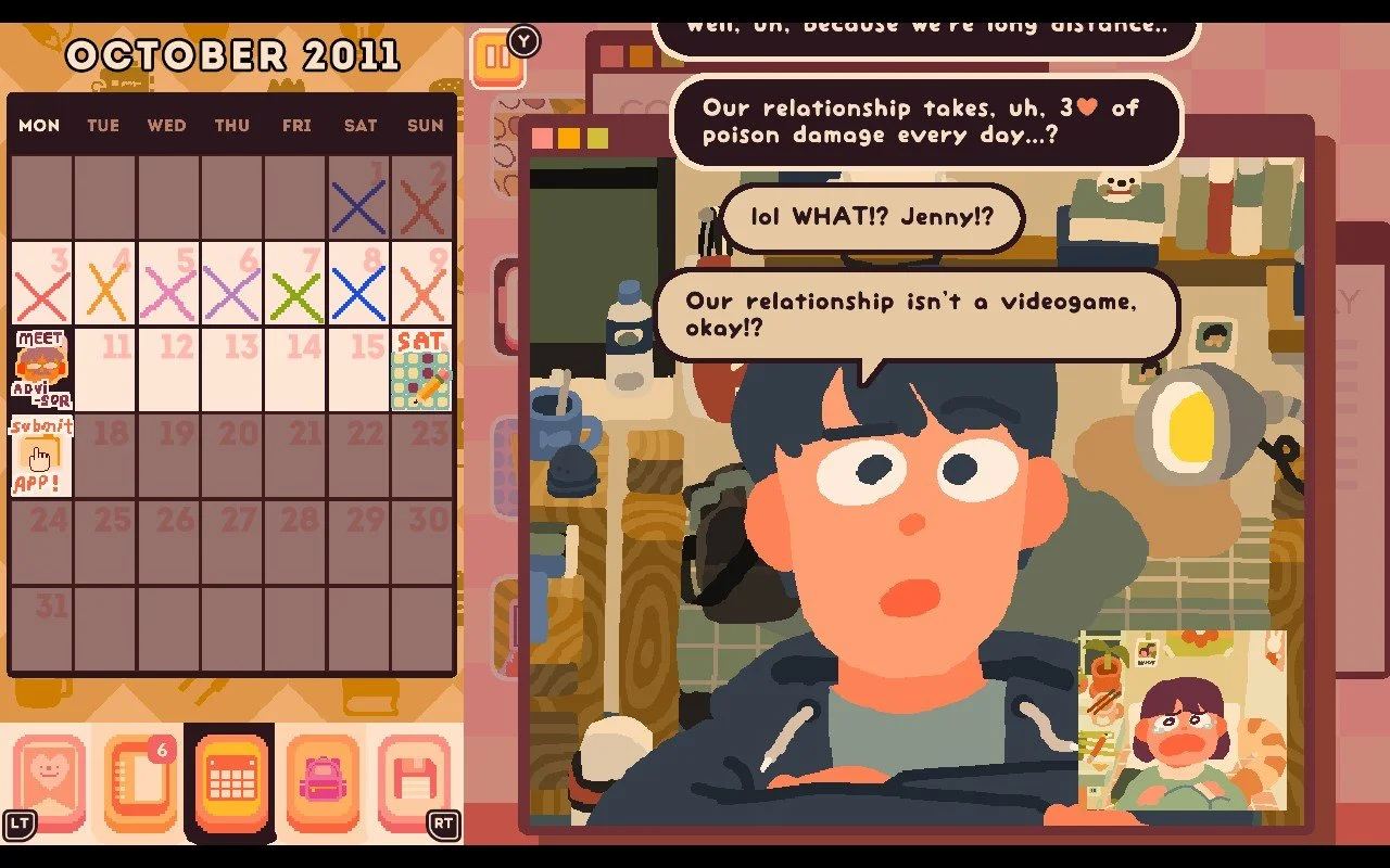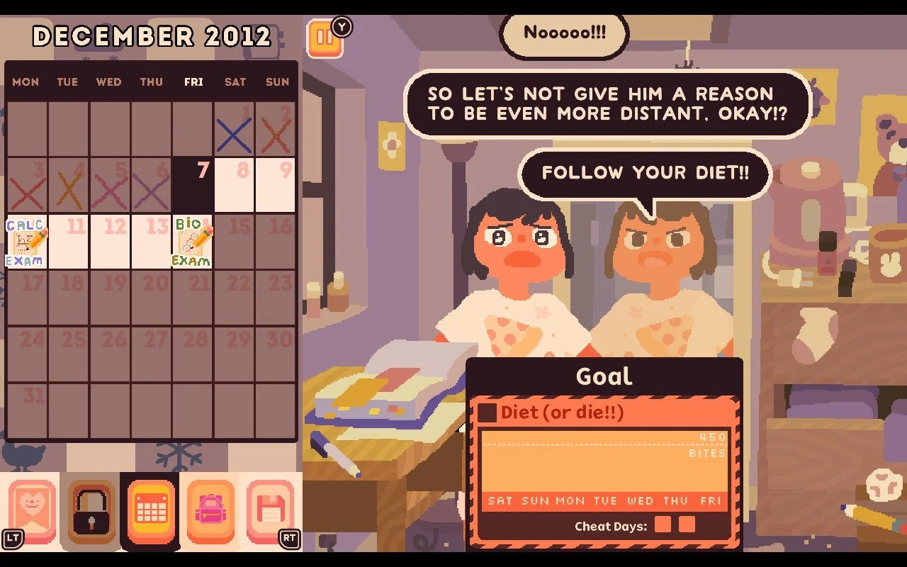 Ma cosa fa Consume me per meritarsi un posto in questo ipotetico podio dei memoir videoludici a tema bildungsroman? Innanzitutto ne ho adorato l’umorismo. Un continuo prendersi in giro e prendere in giro anche il giocatore. Non c’è la comicità sfacciata, surreale, slapstick di Thank Goodness You Are Here, piuttosto le impacciate sventure quotidiane che possono capitare ad un’adolescente. Apro un’altra parentesi spiegone. La comicità è l'aspetto più immediato, un "avvertimento del contrario" che suscita una risata spontanea e istintiva, focalizzata sul puro divertimento. L'umorismo è un sentimento più profondo e riflessivo, il "sentimento del contrario", che parte dalla comicità ma la supera con l'analisi e la compassione, portando alla comprensione delle fragilità umane e a un sorriso più amaro. Fine spiegone, grazie ancora IA. Certo, non mancano situazioni comiche, tipo quando Jenny passa davanti alla vetrina di una pasticceria piena di torte, con l'acquolina in bocca e l’intenzione di entrare, ma poco prima della porta, pesta una cacca di cane e se ne va. Ma in generale il clima che ho trovato è più umoristico e raffinato. Tipo pregare usando una chat sul telefonino direttamente con un certo <3 JC <3 che altro non è che Gesù in persona (tra l’altro c’è una scena dentro una chiesa che da sola vale tutto il gioco, non perdetevela per nessun motivo). O l'amore smisurato per quei simpatici cagnolini che rispondono al nome di spitz tedesco nano. Oppure quando Jenny, in un momento di pura metareferenzialità, parlando di Consume me, dice “È fondamentalmente un fumetto interattivo, sai, tipo Florence!”. Ed è proprio così, alla fin fine, solo che dai trailer non si capisce. Ti fanno credere che sia un GDR infarcito di minigiochi alla Warioware. Infatti, quasi tutto il tempo lo si passa a grindare e far crescere il personaggio. Le quattro abilità da livellare sono già di per sé umoristiche: dieta, accademiche, atletiche, lavoretti. Invece, i contatori da tenere sott’occhio e non far scendere a zero sono tre: umore, energia, intestino. E poi quello più importante di tutti: i morsi. I morsi sono unità fittizie utilizzate per ovvi motivi al posto delle reali calorie, tanto che nel disclaimer si mette subito in chiaro che il gioco non è un manuale di istruzioni per perdere peso. Jenny, come molte adolescenti, complice una mamma troppo invadente che non riesce a non fare confronti con le amiche, ha a che fare con disturbi alimentari, diete e grassofobia. C’è un contatore che indica quanti morsi può mangiare in un giorno. Il momento del pasto viene rappresentato attraverso un minigioco in stile Tetris, dove bisogna inserire tetramini di cibo in un ipotetico piatto cercando di riempire tutti gli spazi “affamati”, senza lasciare vuoti ma stando allo stesso tempo attenti a non superare il par dei morsi, pena il game over dopo un paio di “sgarri” concessi. Non bisogna preoccuparsi però di mangiare troppo, perché c’è sempre l’opzione della ginnastica, portare a spasso il cane e altro. Queste attività, da svolgere nel tempo libero, consumano sì i morsi ma anche i turni. Finiti i turni, finisce la giornata, si va a letto e si tirano le somme. Quasi tutto il gioco è incentrato su un calendario e un’agenda. Entro una determinata data, bisogna raggiungere una serie di obiettivi andando a spuntare una to-do list. Detto così sembra tutt'altro che un fumetto interattivo. Sembra una serie infinita di obiettivi da raggiungere, sempre più complessi e impegnativi tra studio, lavoretti da fare, esami, amicizie, inimicizie, dieta, amore, college, traslochi, il primo amore, l’amore a distanza, futuro lavoro, madre ficcanaso. Praticamente la vita. Più si va avanti, più le cose si complicano. Ma possono complicarsi all’infinito?