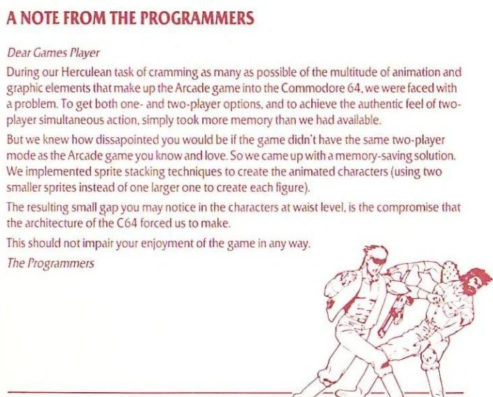 Non c’è da stupirsi: il gioco venne riscritto tre volte da due team diversi. La versione arrivata sugli scaffali ebbe solo sei settimane per essere ultimata ed era scarsa al punto che chi la realizzò chiese di non essere inserito nei riconoscimenti finali, temendo che potesse influire sull’aggiudicazione di commesse future. Come si scriveva, l’impatto estetico non era malvagio, ma i soli due nemici a schermo, il fatto che fossero praticamente tutti uguali salvo nei colori, la mancata interazione con gli sfondi e i vari tagli operati (per dire, il boss finale sfoggia il mitragliatore ma non spara) lo resero tedioso da giocare. La conversione è anche ricordata per essere forse l’unico videogioco della storia a recare una lettera di scuse contenuta all’interno del manuale di istruzioni.