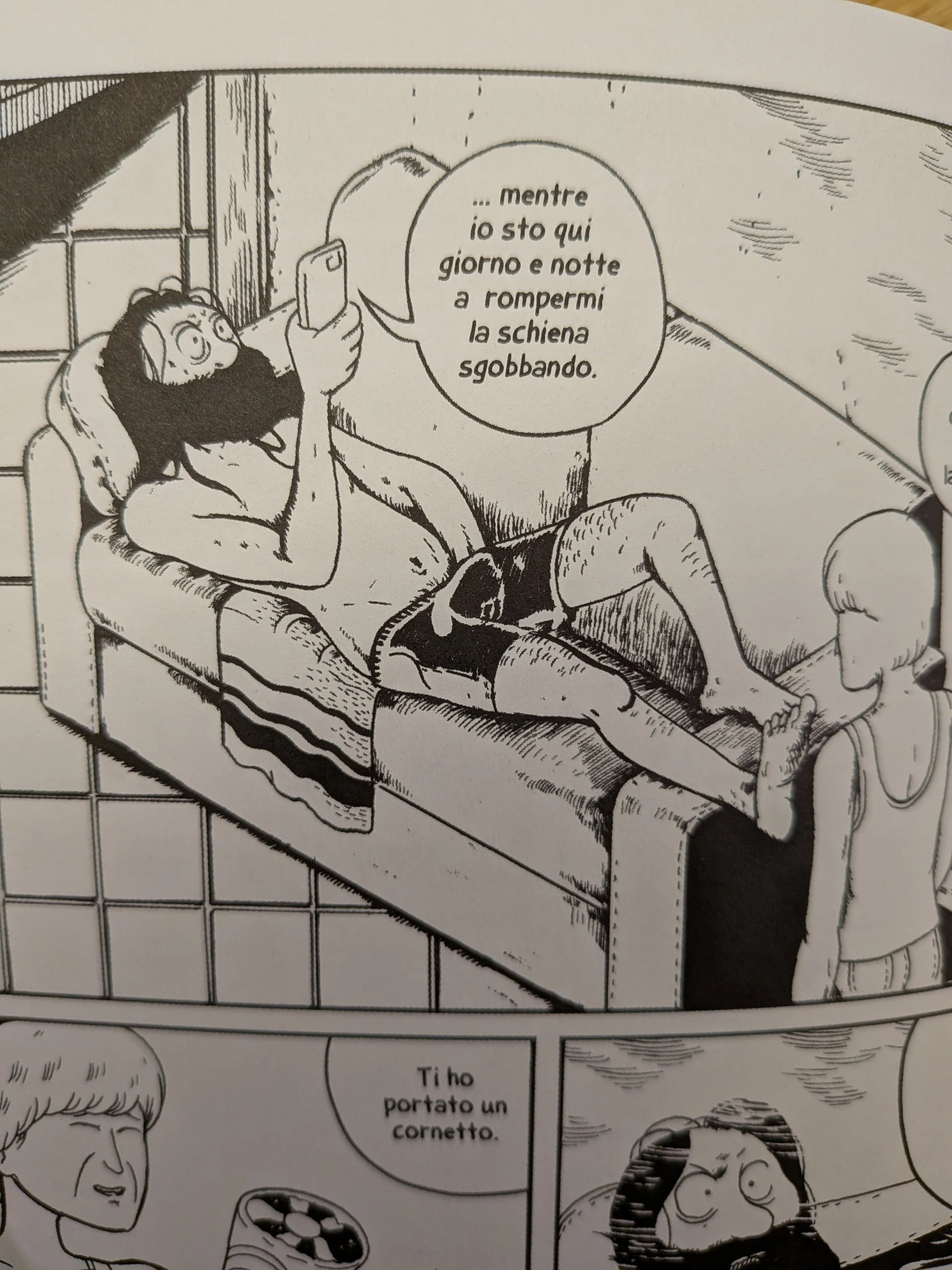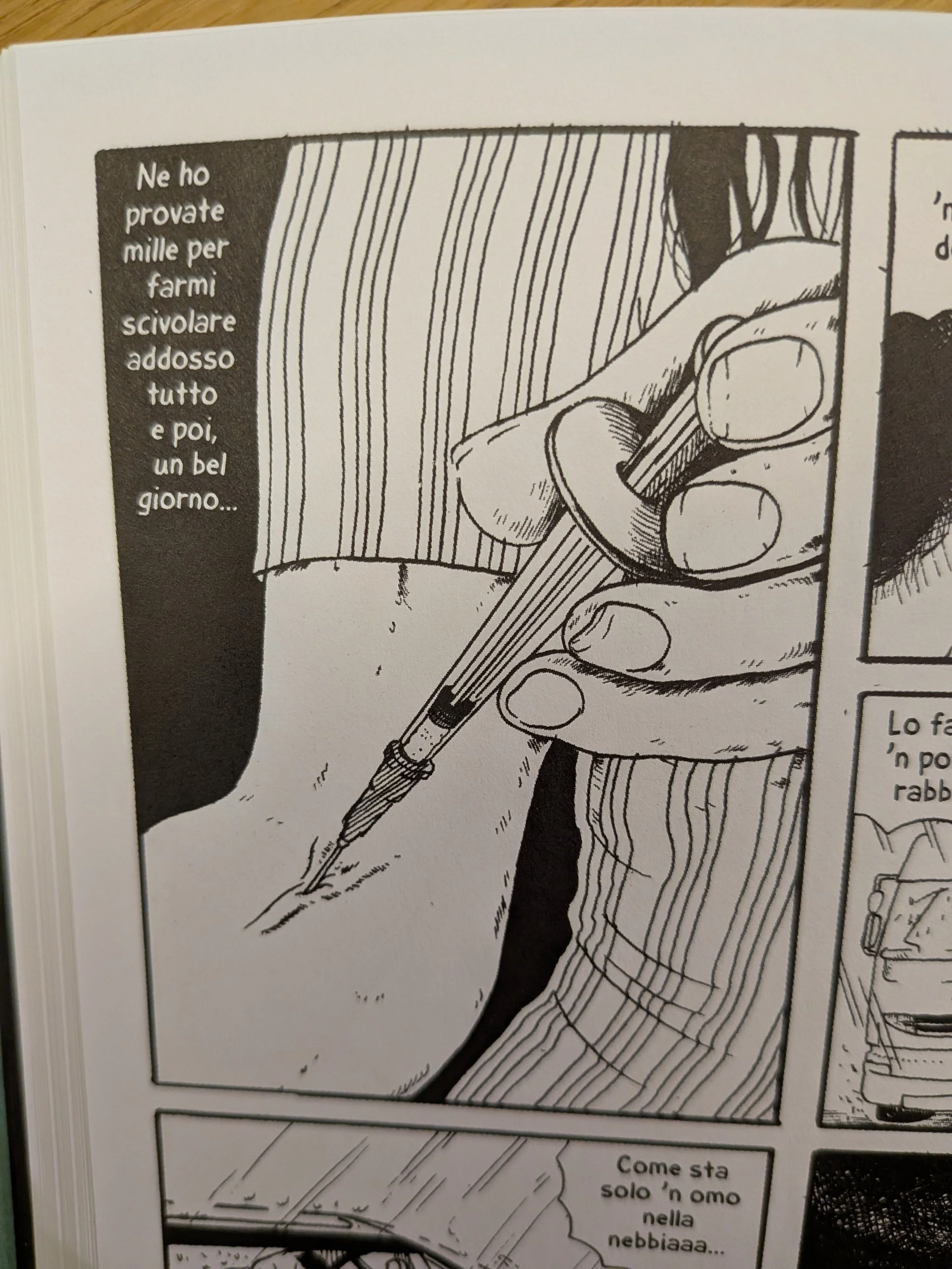 Italo snocciola centinaia di motivazioni per cedere alle droghe e tutti intorno sembrano assecondarlo, nessuno escluso: giovani, anziani, ricchi, poveri, eruditi, ignoranti. Ogni scusa è buona. Italo, in realtà, di problemi ne ha diversi: un lavoro che la maggior parte delle persone non crede neanche sia un lavoro; è quasi sempre al verde e in ritardo con i pagamenti dell'affitto; anche i genitori rimasti in Calabria lo vedono come un mezzo fallito; il rapporto con la moglie è un nervo scoperto e suo figlio a volte un peso. Italo non cerca la ribellione attraverso la droga; al contrario, usa la sostanza come un tappo per non esplodere, per mantenere uno status quo che sta crollando. La dipendenza diventa un meccanismo di difesa contro la complessità del mondo moderno. A differenza del Pompeo di Andrea Pazienza, Italo non fa uso d’eroina (anche se ha provato di tutto), ma di potenti antidolorifici oppiacei. Questa distinzione è fondamentale: Italo non si sente un "tossico" nel senso classico del termine. La sua è una dipendenza che nasce da una prescrizione medica, un male che si nasconde dietro una facciata di normalità borghese, fatta di famiglia e lavoro. È la dipendenza della classe media, che usa la chimica per sopportare il peso di un'esistenza che percepisce come inadeguata. È il ritratto (o meglio ancora autoritratto) spietato e onesto di una generazione (quella dei trentenni e quarantenni) che si crede diversa e reazionaria, che cerca di prendere le distanze dalla gente “comune”, ma che alla fine cade nelle stesse dinamiche e bassezze.