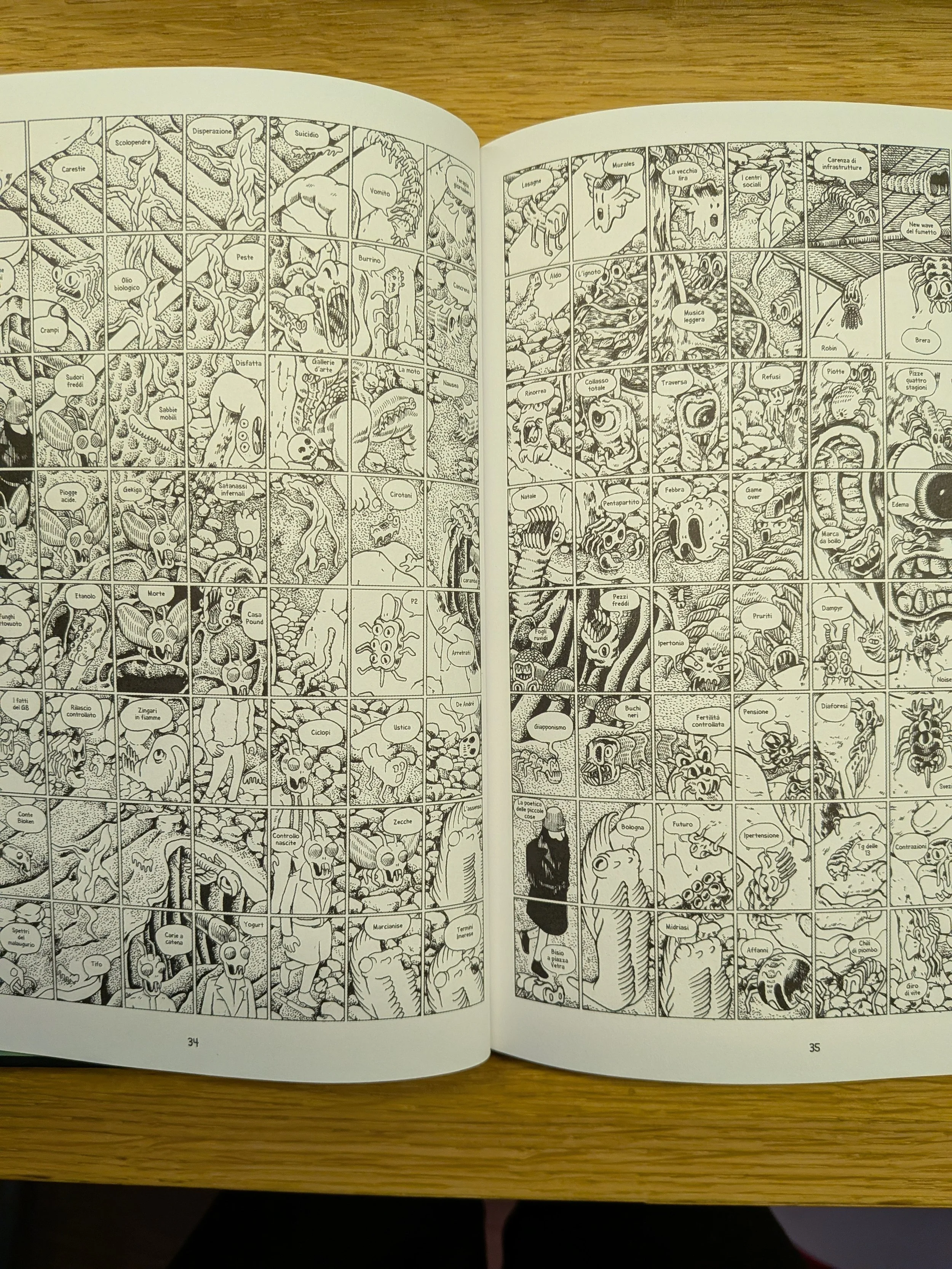 Di ritorno dal SerT, passeggiando con indosso un berretto e un lungo cappotto per una Milano invernale, Italo riflette sulle motivazioni che lo spingono a cedere alle droghe. Parte con una tavola la cui gabbia è divisa in due vignette, che però formano un’unica immagine in cui dice “Sono depresso” nella prima e “Ho nostalgia di casa” nella seconda. Nella tavola successiva, questa volta le vignette sono quattro e continua con: “La schiena a pezzi”, “Nessuno mi capisce”, “Mi sento solo”, “Non ho un lavoro”. Girando la pagina, le vignette diventano otto, anche se compongono un’unica splash page in cui si vede un angolo cittadino con le macchine, le strisce pedonali e alcuni passanti. Qui le persone si uniscono alle giustificazioni di Italo e cominciano a dire le cose più disparate: “Odio il mio capo”, “ Volevo soltanto rilassarmi”, “Dovevo provarla”. Giriamo ancora pagina e le vignette diventano sedici, mantenendo sempre la struttura di splash page, solo che le cose cominciano ad assumere un tono surreale, l’asfalto si trasforma in una sorta di tessuto biologico, come un primo piano sulle rughe della pelle, i pedoni cominciano a perdere i connotati umani ma continuano le lamentele: “Qui al nord non si vive bene”, “Non ho più idee”, “I miei libri non vendono” (questo è Italo/Vincenzo). Le cose precipitano nelle due pagine successive: delle scolopendre scheletriche e giganti terrorizzano la gente che cerca di scappare via terrorizzata ma continua ad urlare motivi sempre più assurdi: “L’INPS”, “I profughi”, “La scomparsa delle api”, “L’antropocene”, “Il cazzo”, “La fica” (per par condicio). Nell’ultima e delirante serie, le sessantaquattro minuscole vignette vanno a comporre un quadro che non ha nulla da invidiare agli orrori e sevizie del miglior Hieronymus Bosch. Tutti gli umani sono stati soggiogati e trasformati in orribili creature da un’entità ciclopica, ma continuano nonostante tutto ad avere pensieri stravaganti per giustificare la dipendenza: “Stitichezza”, “Crollo di like”, “Sopravvivere a un figlio”, “Game over”.