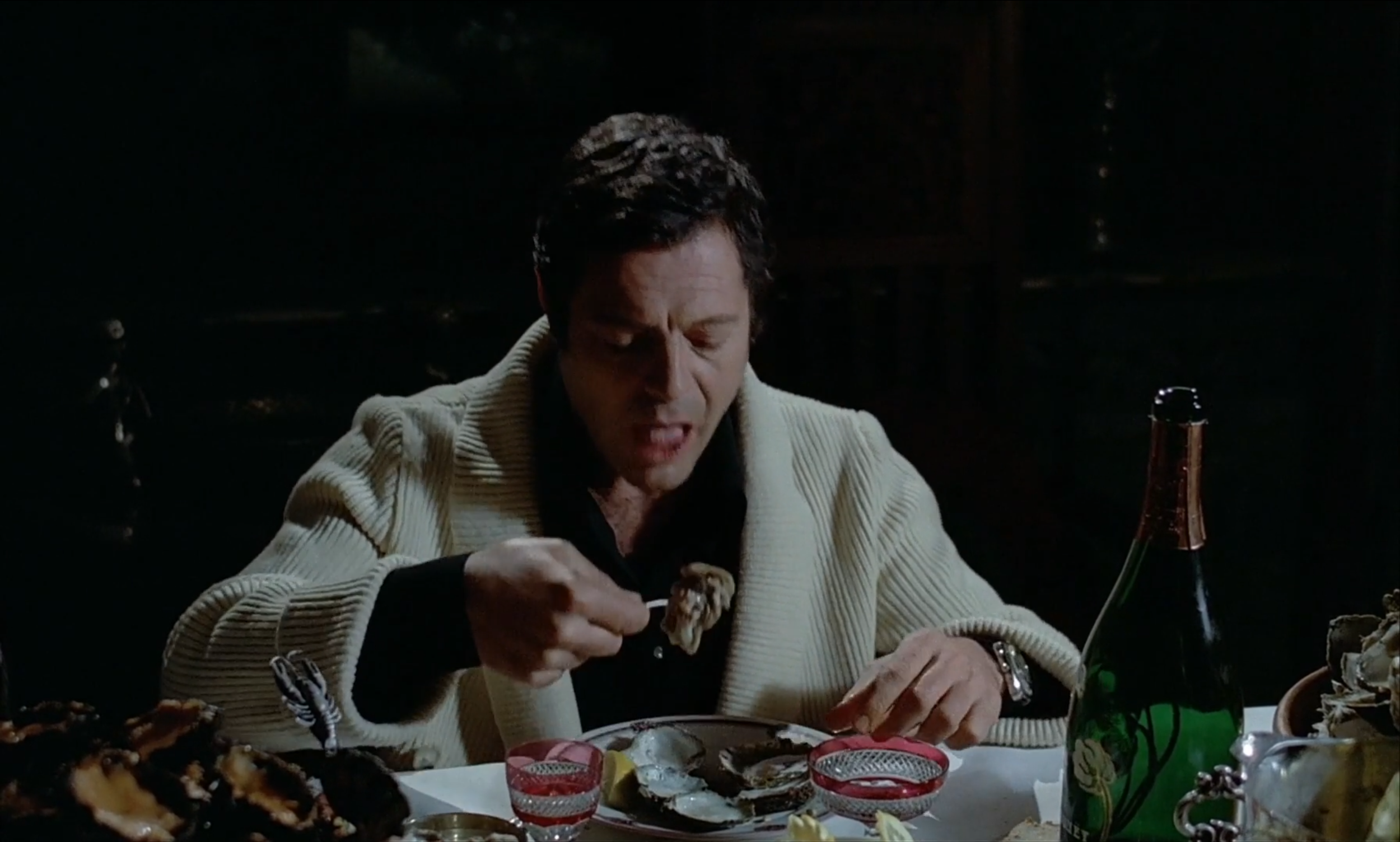 Nello sguardo di Mastroianni c’è una incontenibile violenza che traspare anche dal meccanicismo col quale infilza e ingolla un gran numero di ostriche. Non a caso è il primo che muore per la sua incapacità di scendere a patti con l’impotenza, decidendo di abbandonare la festa alla guida della Bugatti che ha rimesso in funzione con fervore quasi religioso, e che richiama il mito futurista e ultra borghese della macchina, della velocità, della potenza sessuale maschile sostituita al pulsare dei pistoni del motore eccetera… .
