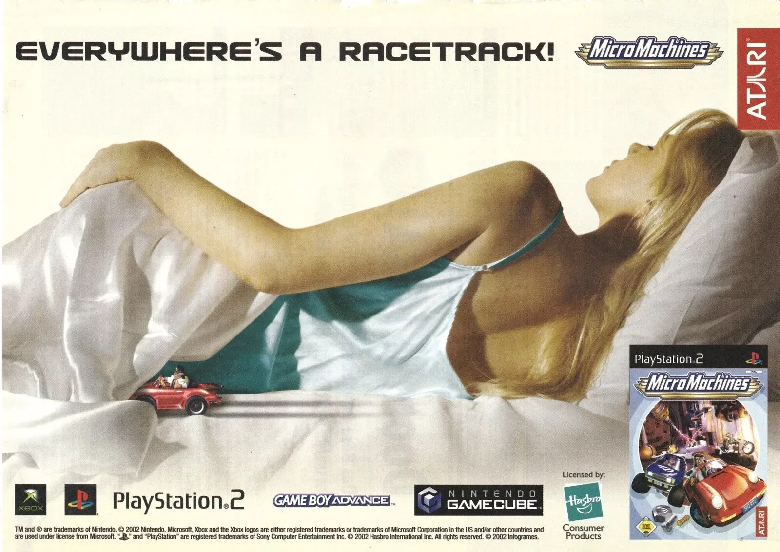 Il tema della coppia ha anche ispirato pubblicità meno sfacciatamente titillatorie, che sfruttavano il doppio senso con un pizzico di intelligenza in più, quale la divertente campagna stampa di Micro Machines V3. Codemasters si trovava nella difficile situazione di avere per le mani un brand forte ma legato a doppio filo con la preadolescenza: Micro Machines come i modellini d’auto de facto per l’infanzia e Micro Machines come caposaldo del multiplayer proveniente da una generazione precedente. Generazione che, con l’arrivo del poligono, sembrava ad un’era geologica di distanza. L’allusione al farlo sul tavolo da cucina o in giardino giocava con guasconeria sull’equivoco, marcando la differenza di attitudine con gli episodi a 16 bit e cercando di destare l’interesse del pubblico post-Wipeout.