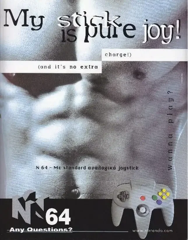 Dalla masturbazione agli attributi maschili, anche da un punto di vista meramente anatomico, il passo è breve. In quanto culturalmente spesso associati alla potenza, il loro connubio con una tecnologia che punta a superarsi costantemente per stupire l’utenza pareva, ai tempi, un matrimonio celebrato in paradiso. Non c’è dunque da stupirsi nel trovarsi un Rayman che davanti a un orinatoio ammutolisce tutti per le sue “huge features” o Simon the Sorcerer 3D che gioca la carta della magia, della bacchetta e dell’ambiguità del termine “wand”. College humor, indubbiamente, che era però quasi fisiologico: i giochi erano creati da team di poco più di ventenni, c’è da immaginarsi che i reparti marketing incaricati delle loro campagne non fossero da meno. Si sfornavano meme prima dei meme, con pubblicità che tendevano a prendere in giro, a pretendere attenzione, a titillare più l’ego del creativo che a trovare una reale connessione col prodotto. Si viveva in una sorta di far west, in un mercato non più così piccolo da non far rumore ma neppure così ingessato da essere diventato corporate. Al contempo il videogame, che si rivoluzionava nella forma (il 3D) e nell’utenza, viveva una crisi d’identità. Le vecchie strategie comunicative fatte di famiglie intorno al focolare catodico (prima) e di ragazzini esaltati (dopo) non definivano più il medium e non ne contenevano le ambizioni. PlayStation stava per prendere il largo e i vecchi leader si agitavano tra crisi di identità (Nintendo) e aspettative infrante (Sega). Dove c’è caos, la volgarità crassa e le batture da osteria prosperano. Così il joystick, simbolo fallico d’elezione (con la “L”), già latore a partire dalla sua denominazione di doppi sensi da darsi di gomito, diventa facile vettore di allusioni. Il “bastone che dà gioia”, dunque, viene celebrato anche da un’insospettabile Nintendo (che negli anni ’90 si trovò costretta a inseguire Sega e Sony sul campo della provocazione) con la prima console della storia ad avere di default un pad con leva analogica integrata, il Nintendo 64.